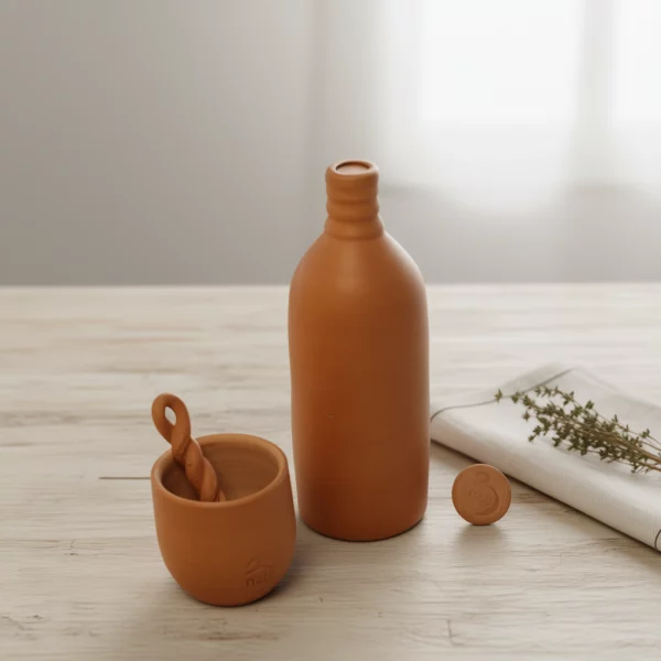 Handcrafted clay water bottle with natural filtration and cooling properties.